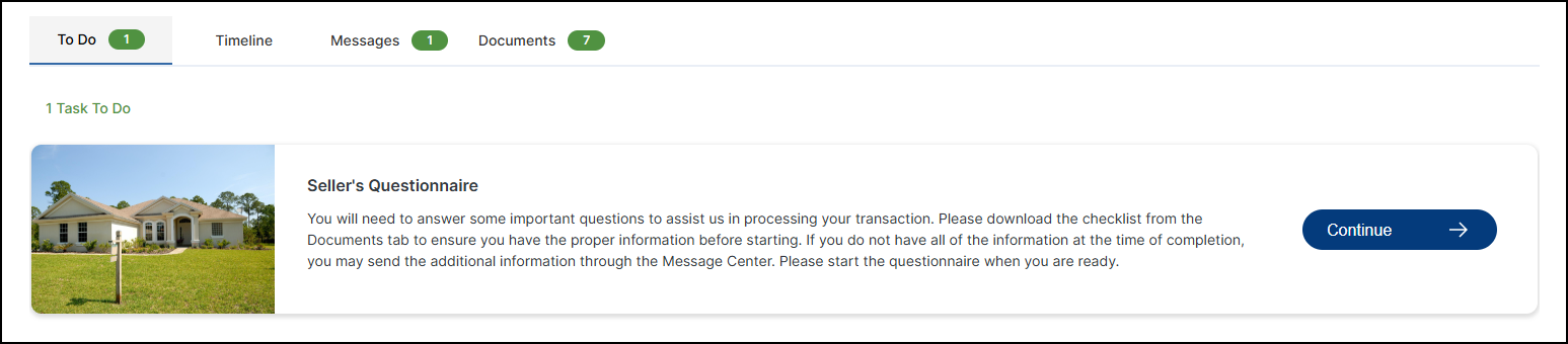 If you’re unsure which questions still need to be completed or run into issues accessing the questionnaire, please contact your escrow transaction team through the Message Center for assistance.