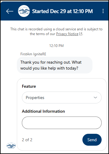 To receive in-app support, click the support button at the bottom right corner of your screen and provide a description of the issue in the field provided. Alternatively, you can email the details along with a screenshot to IgniteRE@firstam.com.
